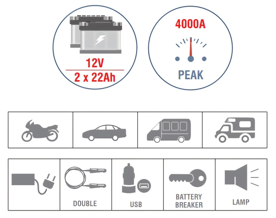 - Potenza di picco: 4000Amp x 12 V